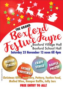 Boxford's traditional Christmas fair Boxford Village Hall and Boxford Primary School Festive Stalls, Father Christmas, Crafts, Raffle. Gifts, jewellery, pottery, food, mulled wine, hamper raffle, jolly jars. Free Entry to All!
