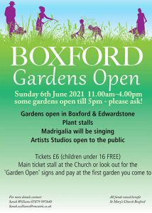 Gardens open in Boxford & Edwardstone Plant stalls Madrigalia will be singing Artist Studios open to the public Tickets £6 (Children under 16 FREE) Main ticket stall at the church or look out for the 'Garden Open' sign and pay at the first garden you come to. All funds raised benefit St Mary's Church Boxford