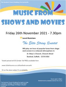 Local musicians The Elite String Quartet Will play an hour of popular tunes from stage and screen in a relaxed atmosphere in St Mary's Church, Boxford Tickets priced at £10 (under 18s FREE) available from www.ticketsource.co.uk/Boxford-Concerts or on the door subject to availability Doors open 6:30pm Refreshments available before the music. The Boxford Church Buildings Trust exists to help conserve, maintain and improve the fabric, furnishings and fittings of St. Mary's Church, Boxford.