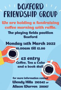 We are holding a fundraising coffee morning with raffle. The playing fields pavilion, Boxford Coffee, Tea & Cake and a book stall. For more information contact Wendy Hills 210342 or Alison Warren 211067