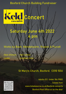 Boxford Church Building Fundraiser Veld ensemble Concert Works by Bach, Mendelssohn, Rossini & Purcell Oboe d'arbore Neil Carlson Johnathan Acton Adults £12 Under 18s FREE tickets from www.ticketsource.co.uk/boxford-concerts Boxford Post Office or on the door.