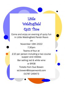 Come and enjoy an evening of quizzy fun in Little Waldingfield Parish Room Teams of four at £10 per person including a two course supper and nibbles Bar selling red & white wine or BYOB Tickets from Sue Bowen sd.bowen@btopenworld.com 01787 249473